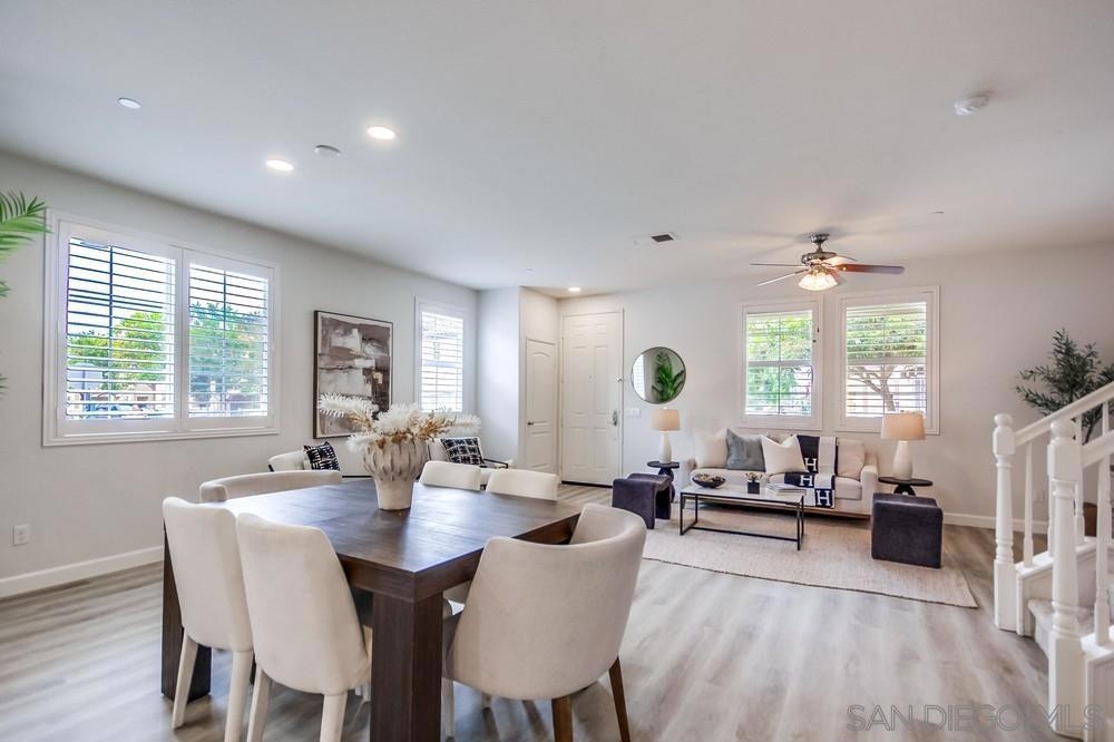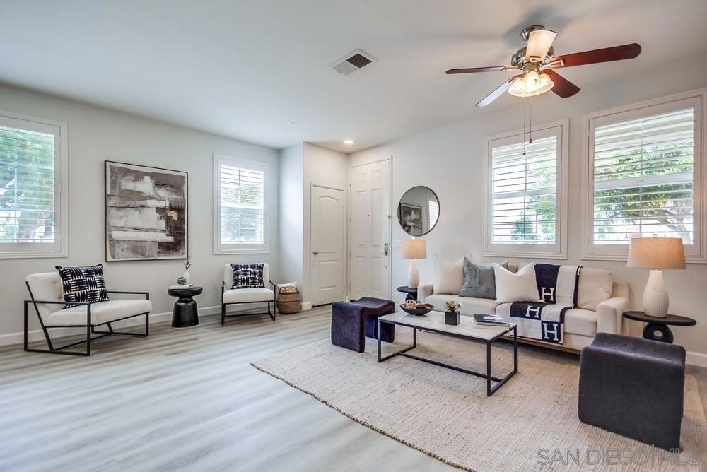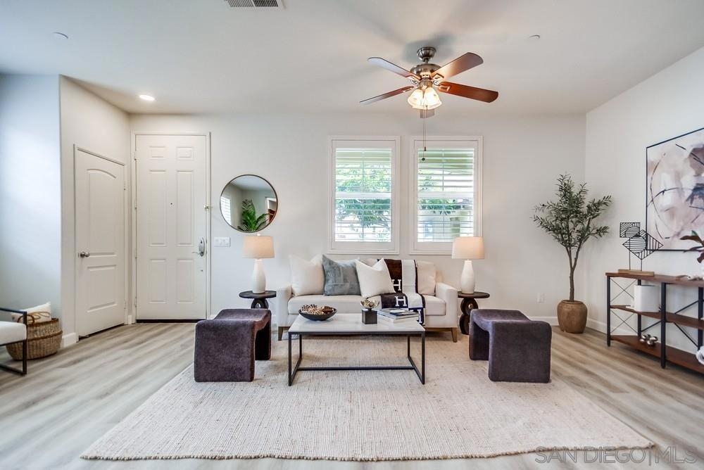 Welcome home to this turn-key end-unit townhouse in the desirable Otay Ranch community! This quiet home is attached on only one side and features a bright, airy interior with brand-new luxury vinyl plank flooring throughout the living areas, new carpet upstairs, and fresh white paint that enhances the feeling of space and light. The open floor plan is perfect for entertaining, while 10-foot ceilings throughout add an extra sense of openness. The kitchen is a chef’s dream, boasting custom hardwood cabinetry, granite countertops, and a huge kitchen island. Enjoy new LED recessed lighting in the living area, a convenient half-bath downstairs, and most windows fitted with high-end wood plantation shutters. Upstairs, you’ll find three spacious bedrooms, including a primary suite that boasts a huge walk-in closet and a separate water closet. Step outside to your private patio, perfect for morning coffee or evening BBQs.
