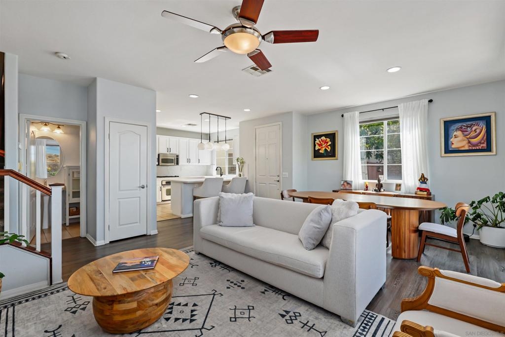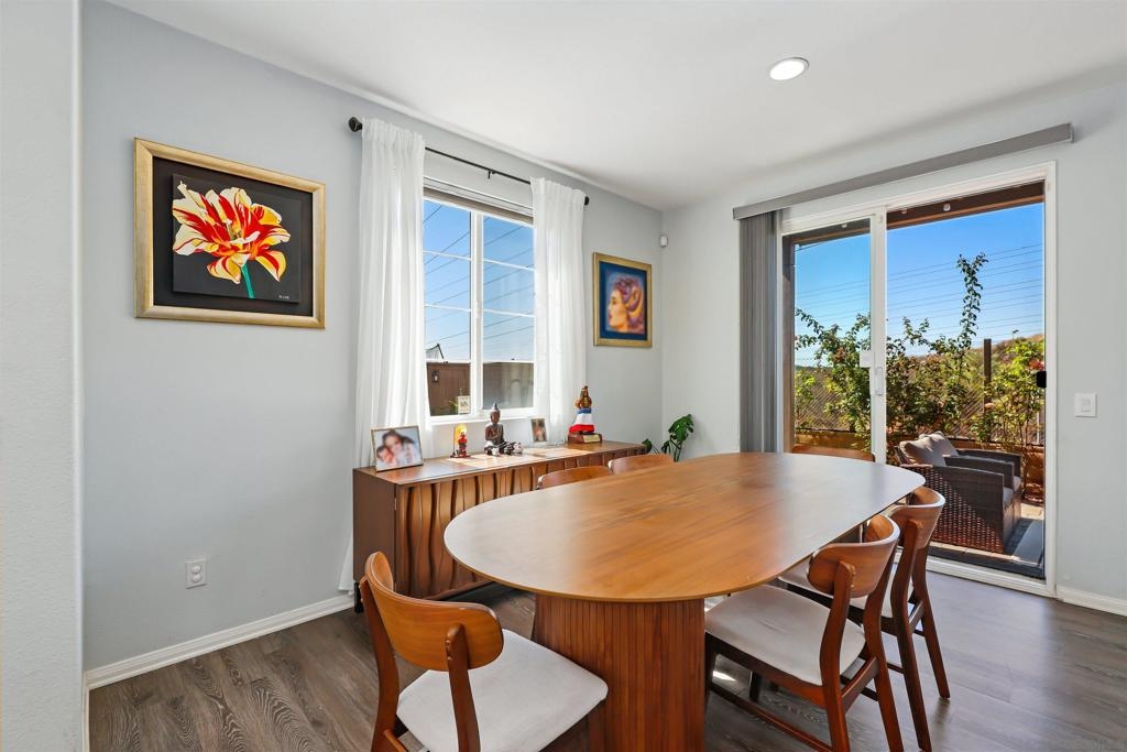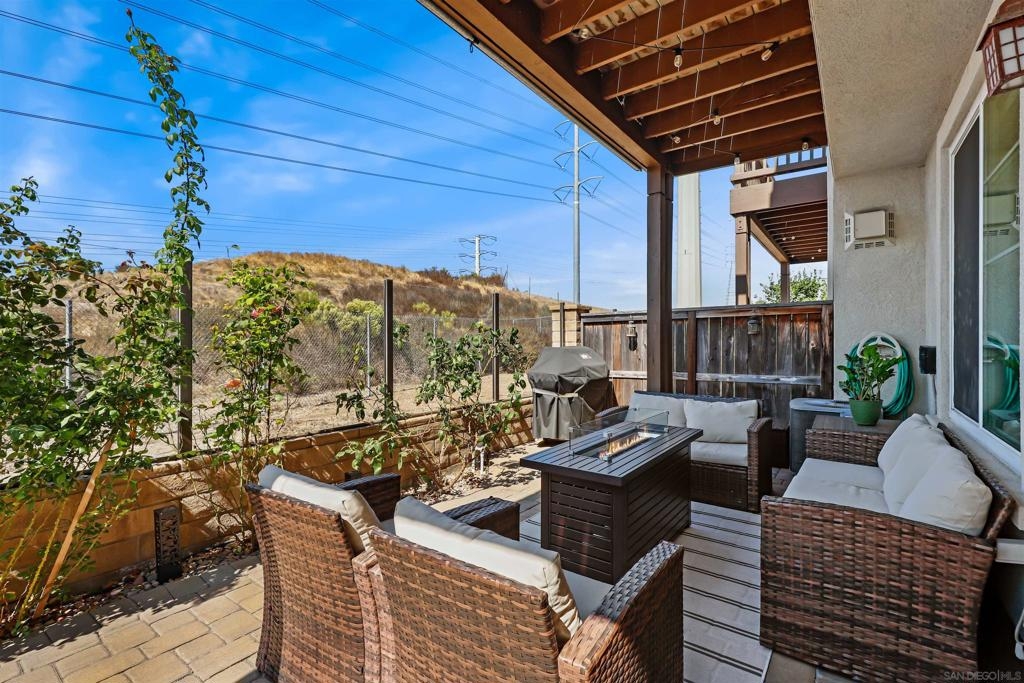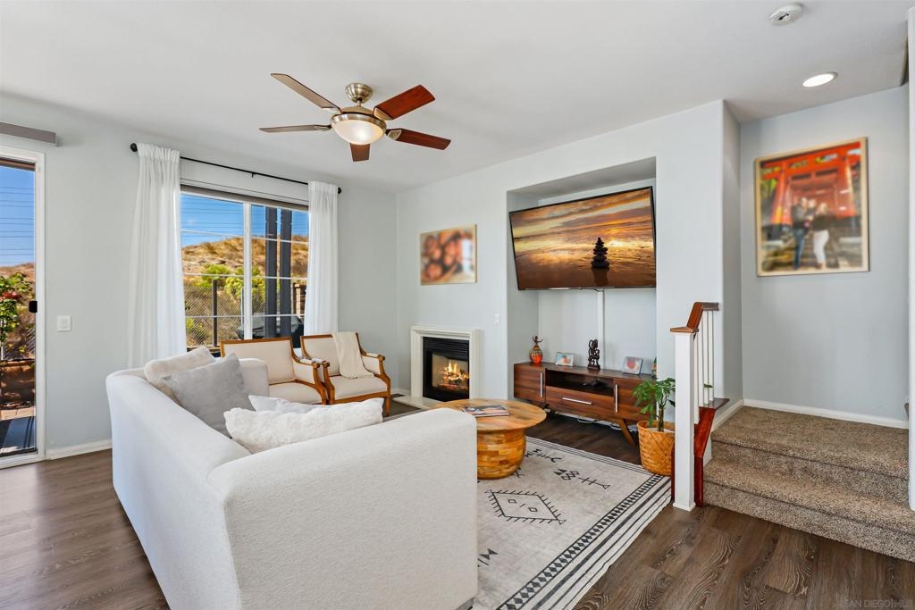 Welcome to your dream townhome! This stunning 3-bedroom, 2.5-bathroom gem is nestled in a serene neighborhood, offering the perfect blend of tranquility and breathtaking views of the ocean and hills from your own private deck. As you enter, the beautifully landscaped front entrance invites you into a cozy open-concept living area adorned with laminate flooring and custom light fixtures. The spacious kitchen, equipped with stainless steel appliances and elegant quartz countertops, makes cooking and entertaining a true delight. Enjoy gatherings in one of the largest backyards in the community, thanks to its coveted end-unit location—ideal for sipping coffee in the morning or hosting friends and family in the evening. Retreat to the spacious primary bedroom, bathed in natural light and featuring a large remodeled bathroom and custom built-ins in the bedroom and linen closets. You’ll love having your own private deck, where stunning views provide the perfect backdrop for relaxation. The two additional bedrooms are equally inviting, offering ample space and sunlight. With convenient access to the community pool, fitness center and gathering areas at the clubhouse. Enjoy close proximity to Mt. San Miguel Park, UC San Diego Health, and a variety of dining and entertainment options, this home is perfectly positioned for your lifestyle. Don’t miss your chance to own this exquisite property!