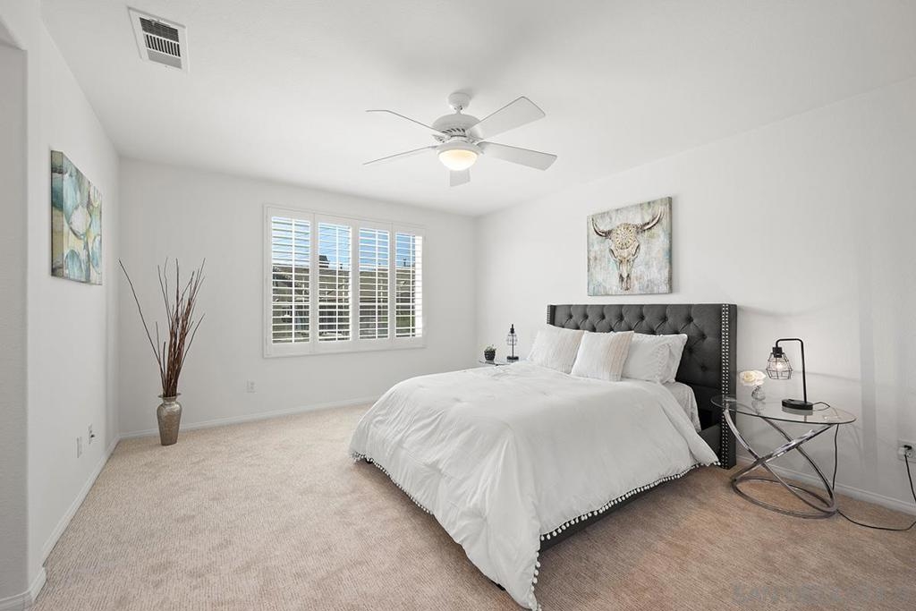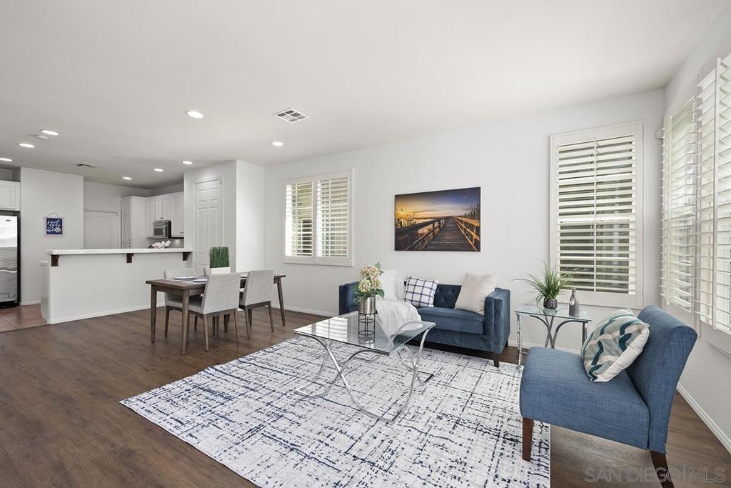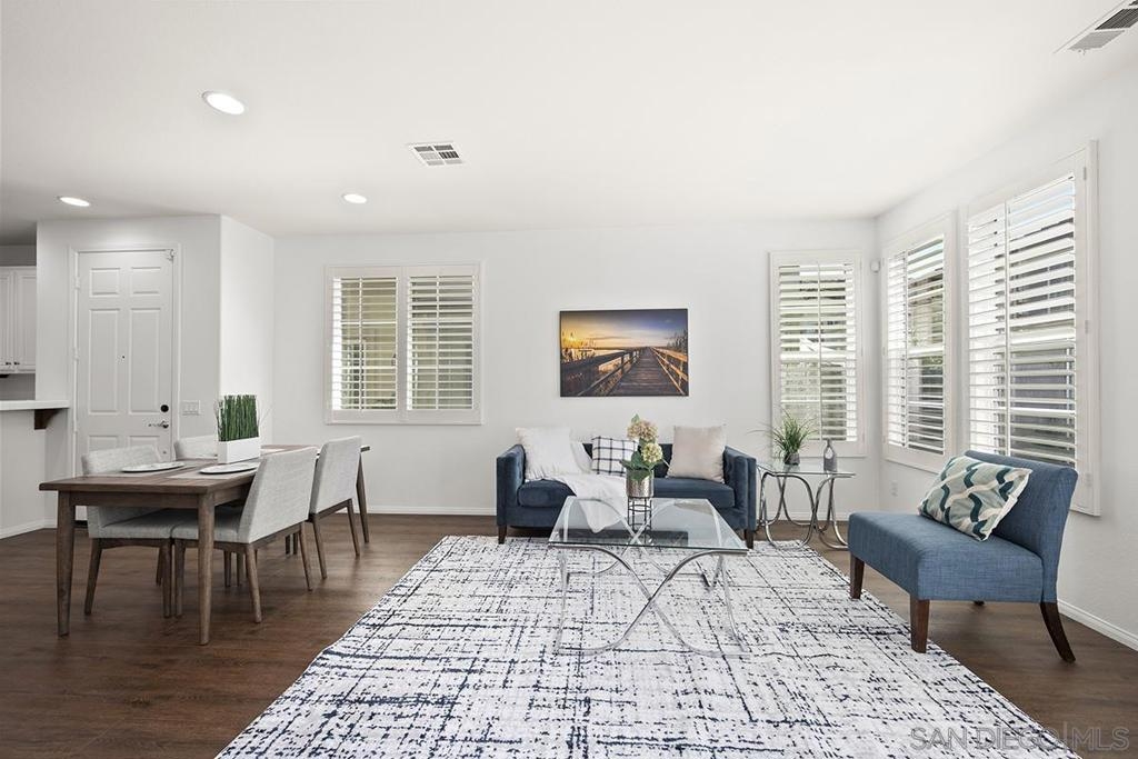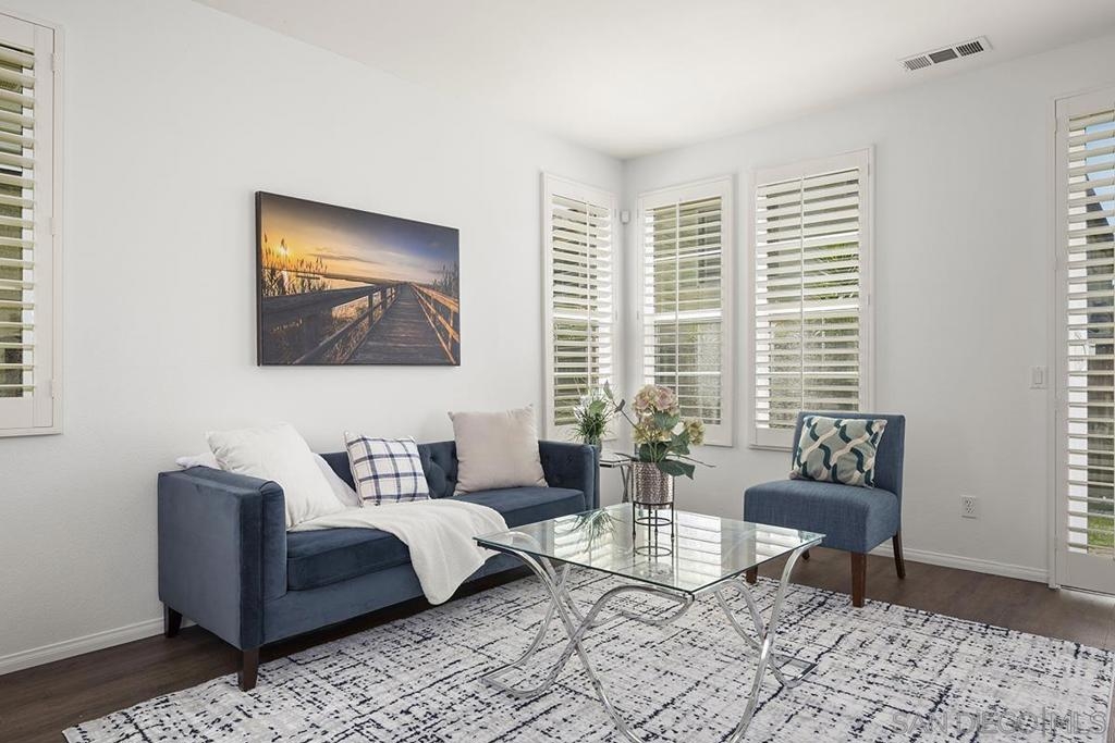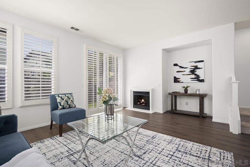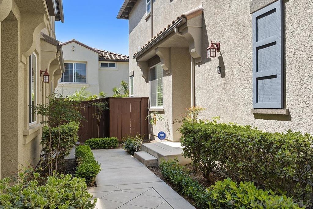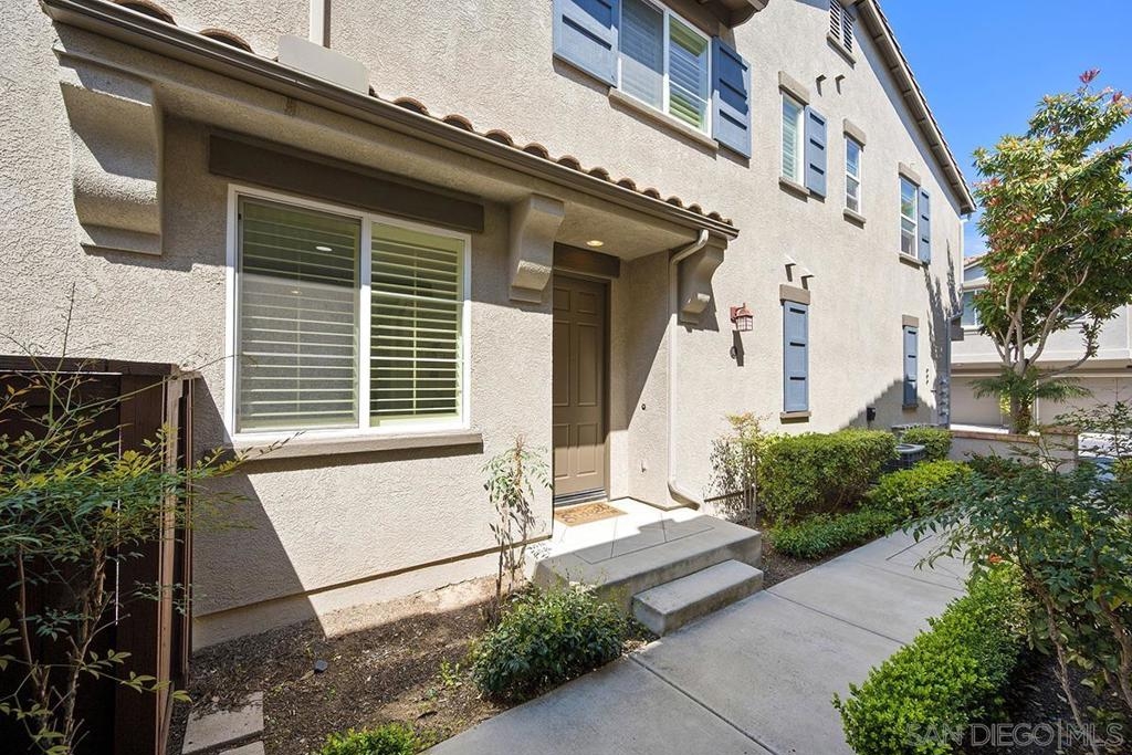 Don't miss this bright and airy end-unit townhome in beautiful Belleza of San Miguel Ranch! With no neighbors on one side and a private backyard, this home offers the perfect blend of tranquility and convenience. The inviting living room features a cozy fireplace, Diamond Peak luxury vinyl plank flooring, and a powder room for effortless entertaining. The open kitchen shines with stainless appliances, ample cabinetry, and recessed lighting. Upstairs, plush new “Champagne Glee” carpet adds warmth to both bedroom suites. The expansive primary bedroom features a generous walk-in closet and ensuite bathroom with dual vanities. The second bedroom also offers its own walk-in closet. Enjoy your professionally landscaped backyard with turf—ideal for al fresco evenings or soaking up the sun. Additional perks include custom window shutters throughout, an attached 1-car garage, dedicated utility room with a full-size washer and dryer, and a prime location within the community. This one won’t last! Nestled in the heart of Chula Vista, San Miguel Ranch offers scenic beauty, modern convenience, and a tight-knit community, surrounded by rolling hills and vibrant sunsets. The planned community’s HOA offers a variety of amenities all in one convenient location, including a pool, spa, children’s water park and tot lot, tennis and basketball courts, a gymnasium, and a clubhouse available for weekend rentals. San Miguel Ranch’s unbeatable location offers easy access to the 125 freeway for seamless commutes, with top-tier shopping, dining, and entertainment just minutes away at The Shops at San Miguel Ranch. Families will appreciate the highly rated schools and excellent school districts, further enhancing the area’s strong sense of community, making San Miguel Ranch an exceptional living experience that harmonizes serenity and practicality.