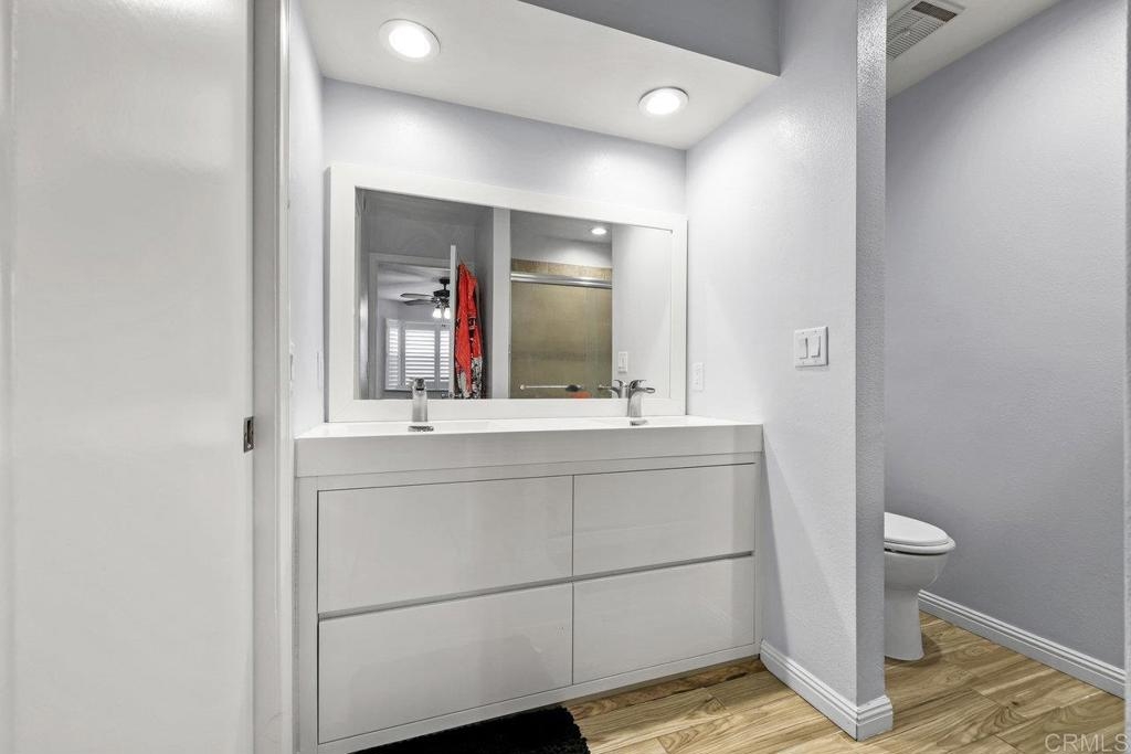 This beautifully upgraded ground floor corner unit is ready to welcome you home! With no stairs involved, it's perfect for easy accessibility. Recent updates like new kitchen countertops, windows, shutters, fixtures, and more make this space feel both modern and serene. Enjoy meals at the breakfast counter or relax on your private patio. The spacious primary suite features a double-sink vanity and a walk-in shower with elegant tile detailing. Conveniently located near the community pool and spa, ideal for a refreshing dip or a relaxing soak. Outdoor enthusiasts will love the community amenities, including pools, playgrounds, scenic trails, and a lake for boat rides. Plus, a VA loan assumption is available for eligible VA buyers. This home offers an incredible lifestyle and a fantastic vibe!