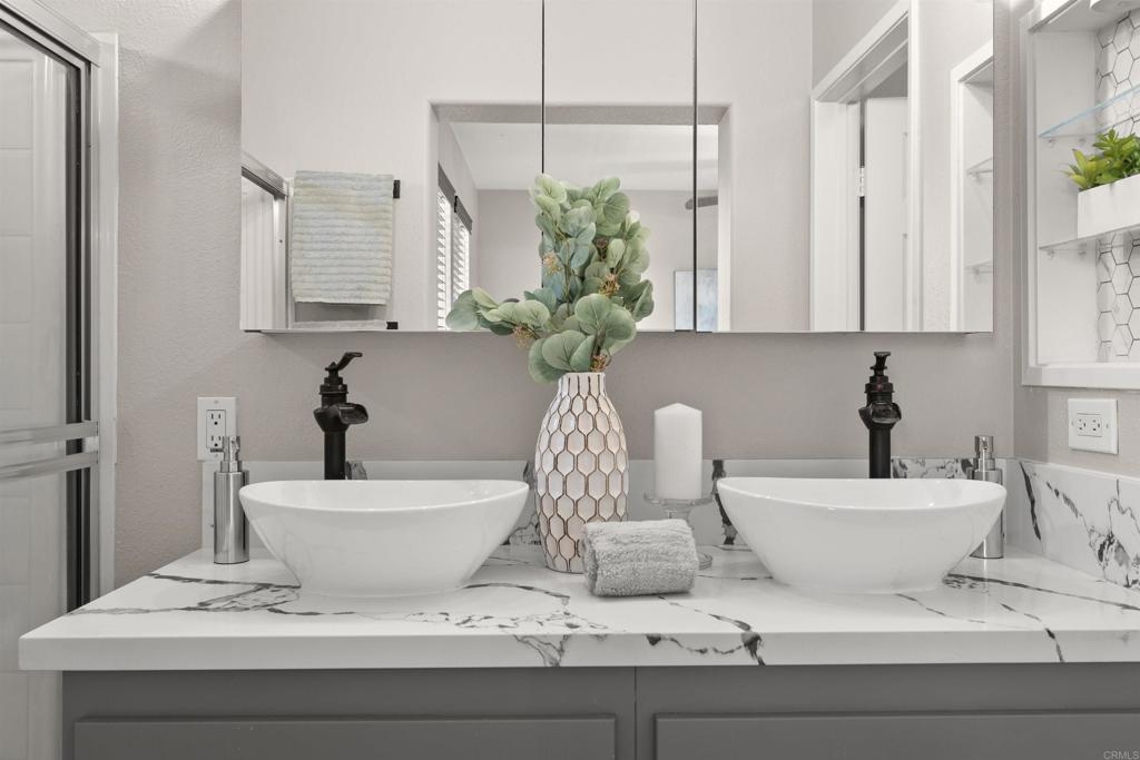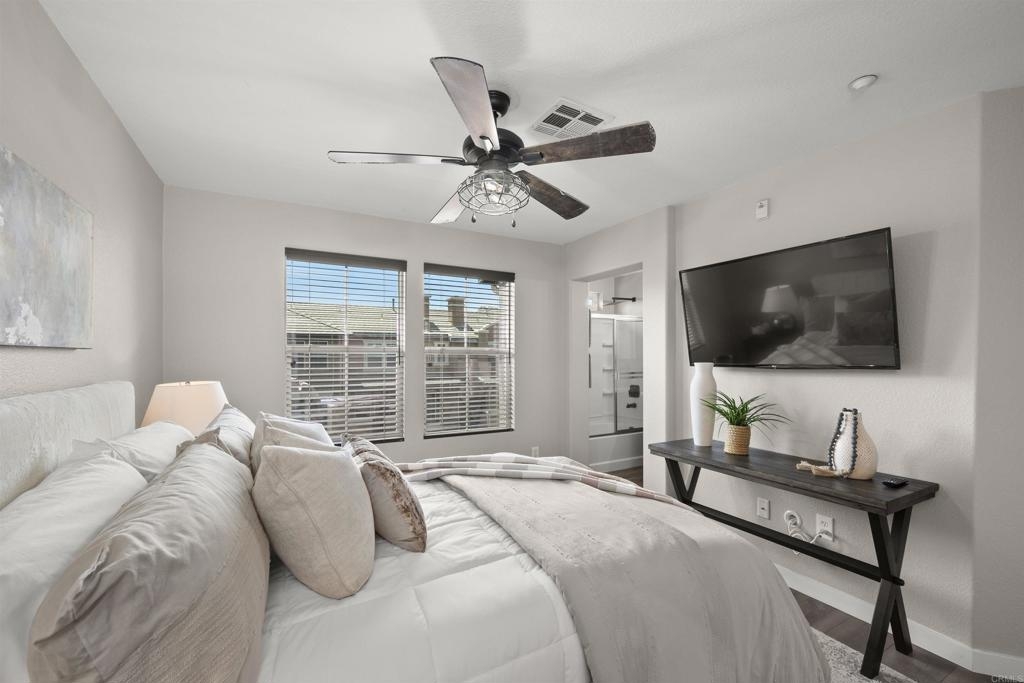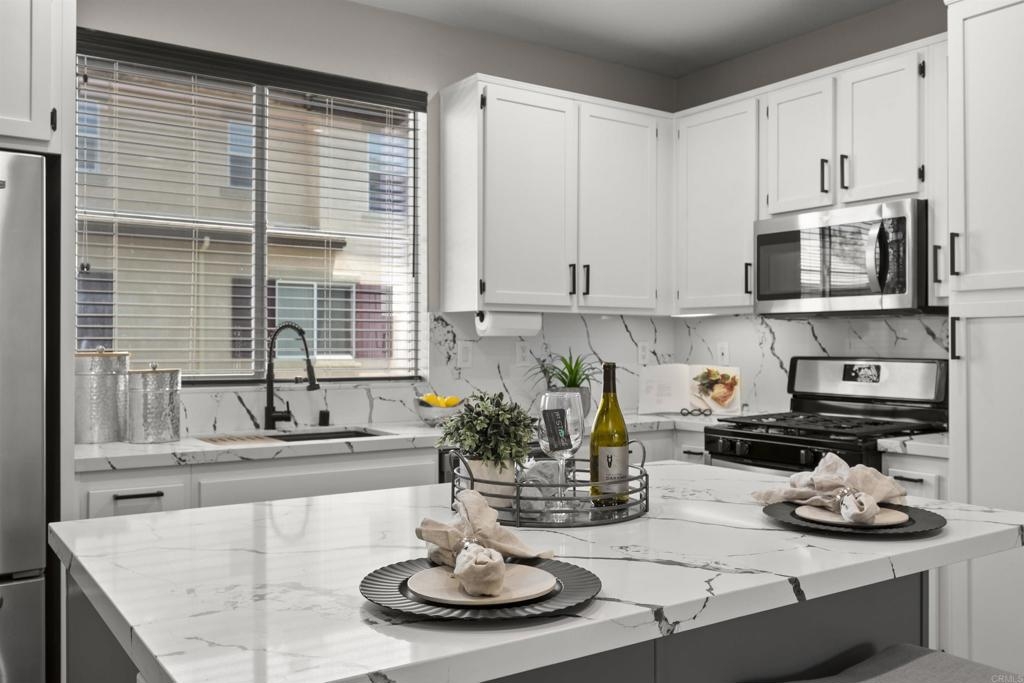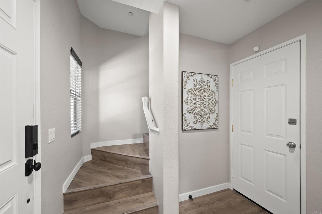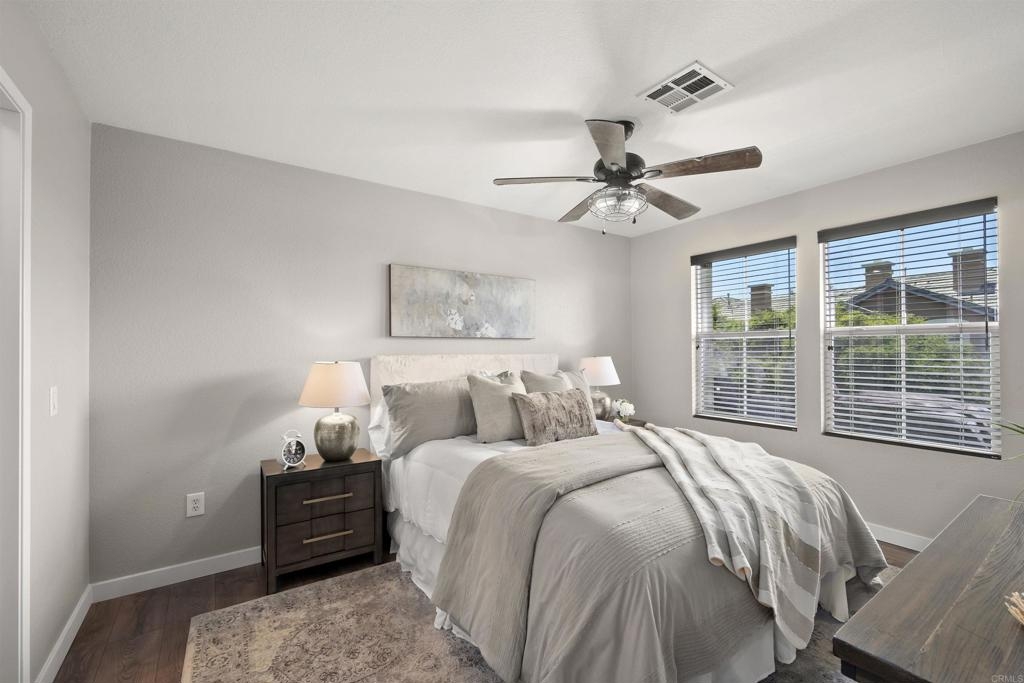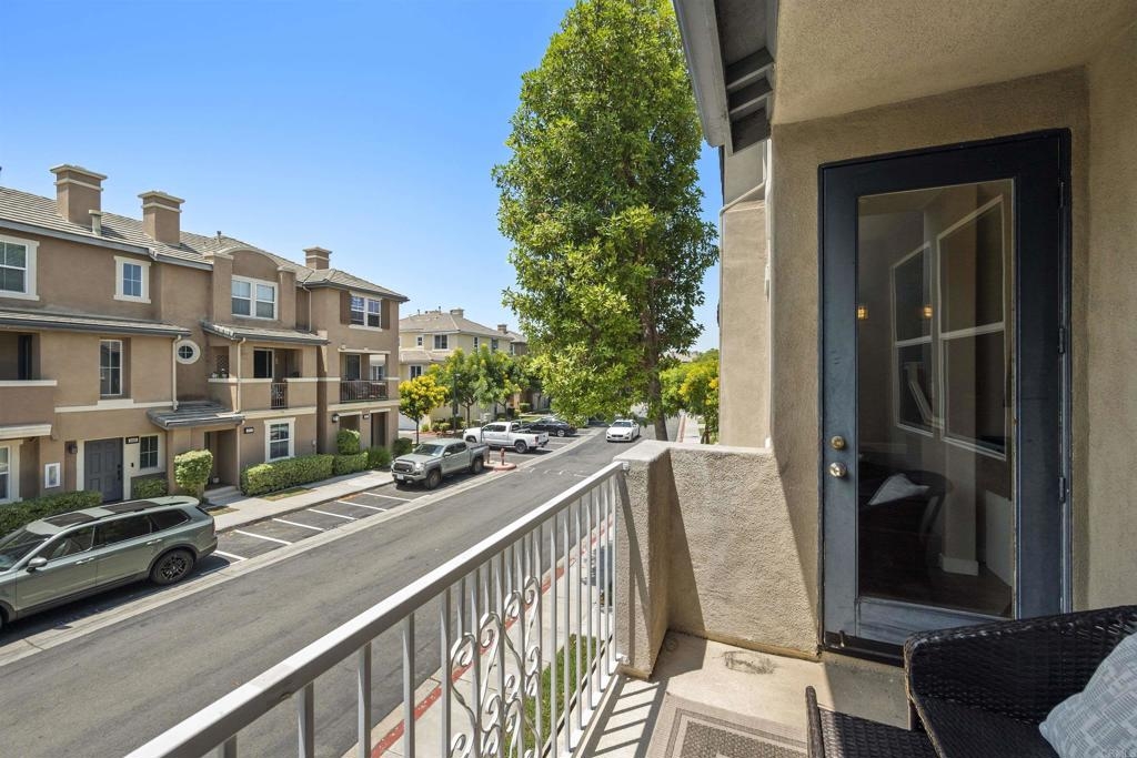 Charming Townhouse in Greystone at Eastlake Vistas. This amazing move-in ready townhouse features 3 bedrooms, 2.5 bathrooms, approx. 1332 sqft., with luxury vinyl flooring throughtout. The first floor bedroom offers a flexible space, perfect for a home office or guest bedroom, with direct access to two car garage enhanced by Swisstrax flooring. On second level, enjoy open floor, including modern kitchen with an island, stainless steel appliances and custom quartz countertops. The dining area and great room provide seamless access to a balcony, The third floor host two master suites, each with updated bathrooms featuring new light fixtures and quarts counterops. This property is equipped with Nest Thermostat, Eufy Security Cameras and Eufy Smart Lock. Enjoy all the Amenities of Greystone and Community of Eastlake Vistas has to offer. Close to high rated schools, Olympic Training Center, Shopping, Restaurant and Toll Road 125, Buyers and buyer's agent to verify everything herein before close of escrow.
