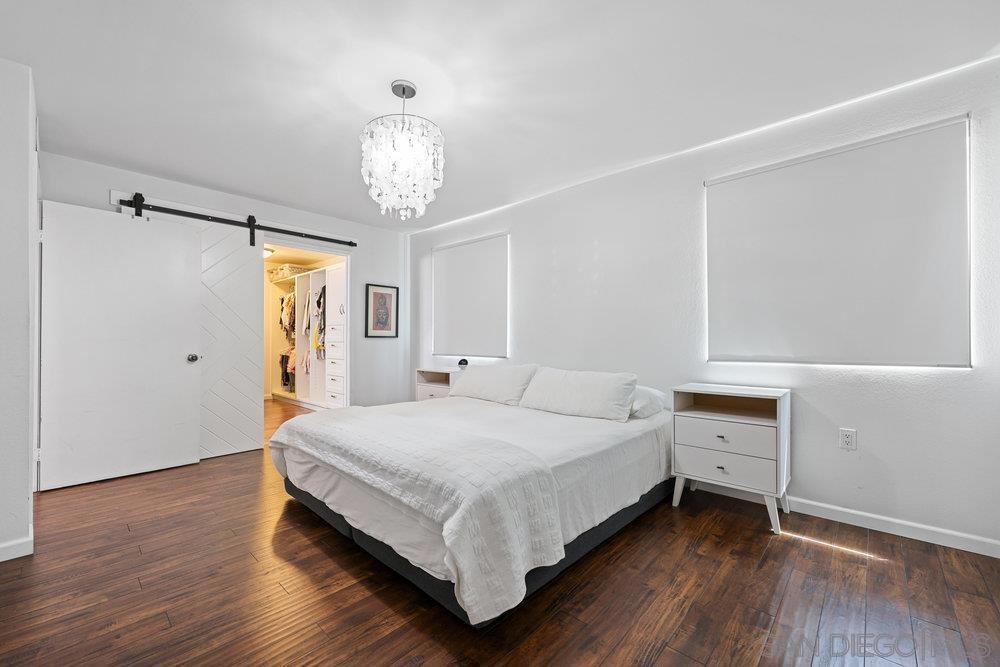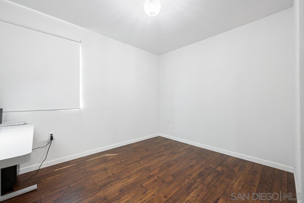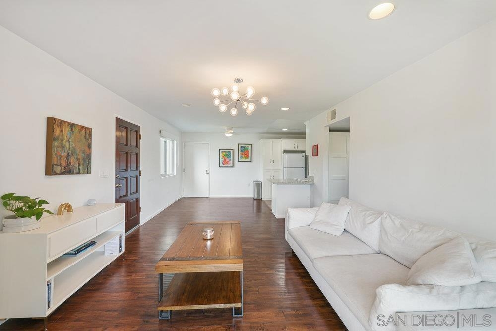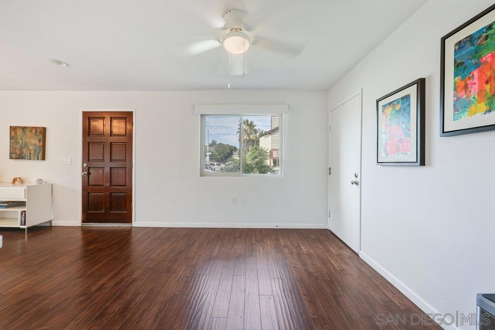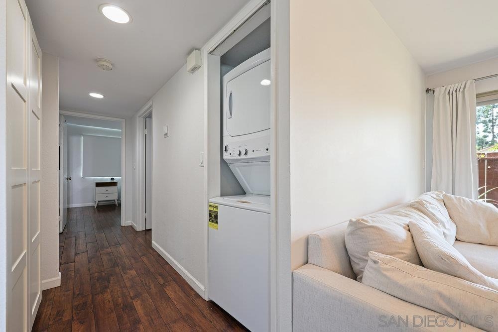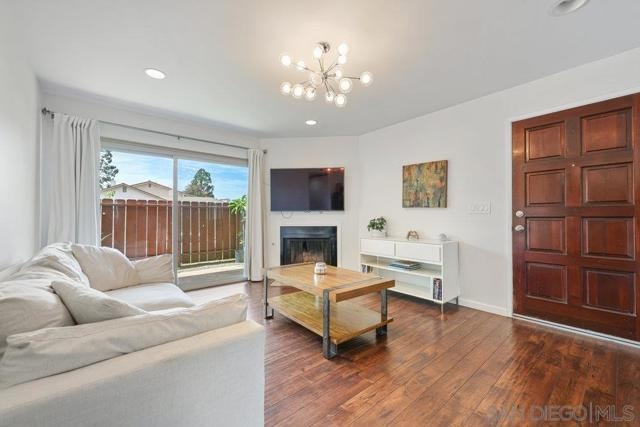 Welcome to this beautifully upgraded downstairs condo, offering 2 bedrooms and 2 bathrooms in a bright, open layout designed for both comfort and style. The kitchen shines with granite countertops, custom cabinetry, and ample workspace for everyday cooking or entertaining. The inviting living room is anchored by a cozy fireplace and flows seamlessly onto a private patio—perfect for morning coffee or evening relaxation. Inside, you’ll find rich laminate flooring, upgraded windows that fill the space with natural light, and a convenient in-unit laundry closet with a stacked washer and dryer. Both bathrooms have been fully remodeled with fresh, modern finishes that create a spa-like feel. The oversized primary suite is a true retreat, featuring a custom built-in wardrobe system with thoughtfully designed cabinets and drawers for maximum storage and organization. This home also includes a private attached garage with direct entry into the residence, plus TWO additional community parking spaces—an excellent combination of convenience and security. The community offers resort-style amenities, including a sparkling pool and a relaxing spa. The location is ideal: just off the 805 freeway, providing easy access to the highway, shopping, dining, and everyday conveniences. Move-in ready and thoughtfully updated, this condo perfectly blends comfort, convenience, and modern style—don’t miss the chance to make it yours!