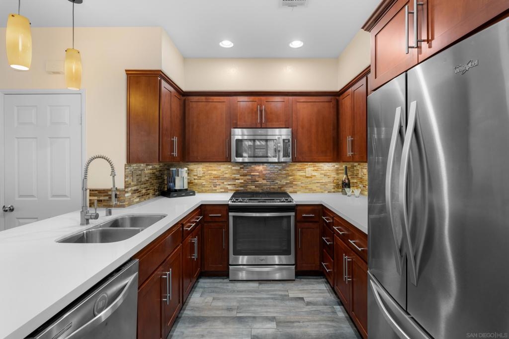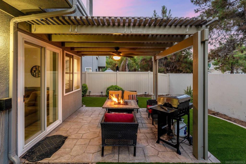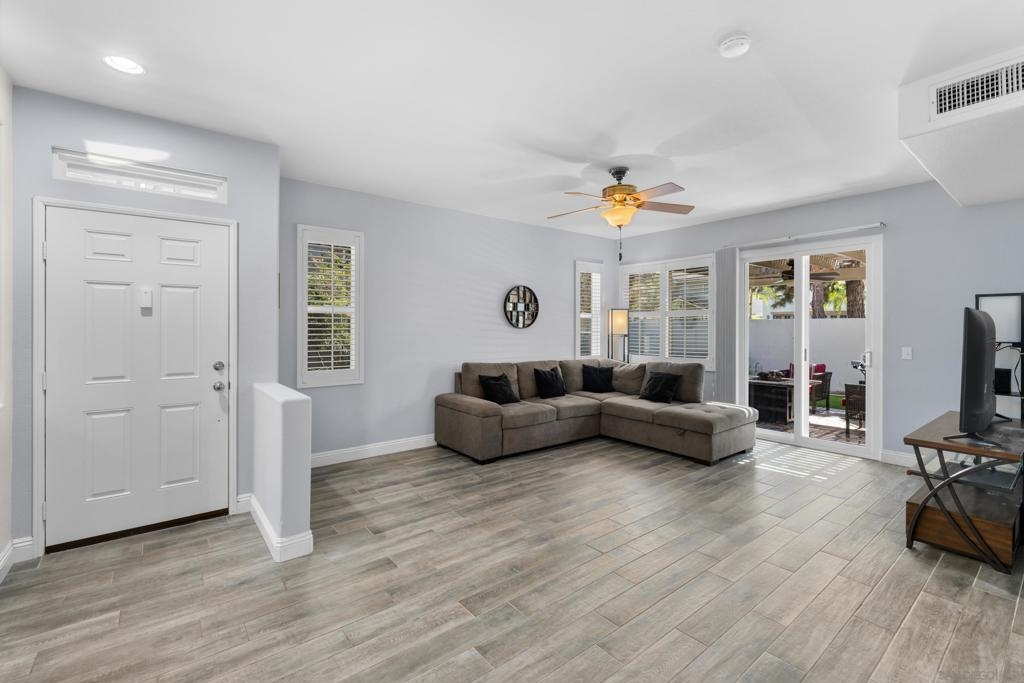 Discover this stunning 3-bedroom, 2.5-bath end-unit townhome in the sought-after gated community of Sycamore Ridge. As the largest floor plan in the neighborhood, this residence offers both space and style. Step inside to find an open-concept design with 9-foot ceilings, abundant natural light, and elegant custom wood-look porcelain tile throughout. The modern kitchen boasts a sleek single-slab quartz countertop, striking custom tile backsplash, rich wood cabinetry, gas range, and stainless steel appliances. The living room features a fireplace, perfect for creating a cozy ambiance on cool nights. Upstairs, you'll find a spacious master suite with vaulted ceilings, a luxurious master bath with dual sinks and a custom walk-in shower, and an impressive walk-in closet. A versatile loft provides additional storage space. Modern conveniences include dual-pane windows, plantation shutters, recessed lighting, efficient forced air conditioning, and laundry hookups located in the garage. Entertain in style on the expansive private covered patio, featuring luxury turf, retractable shades, and a cooling fan. The community features a large park with a playground and basketball courts, while Eastlake III offers two pools, a Jacuzzi, and a clubhouse. Enjoy proximity to the highly-rated schools, nearby restaurants, shopping, and scenic trails. With low HOA fees, this townhome balances luxury with practicality, making it truly a gem in a prime location!
