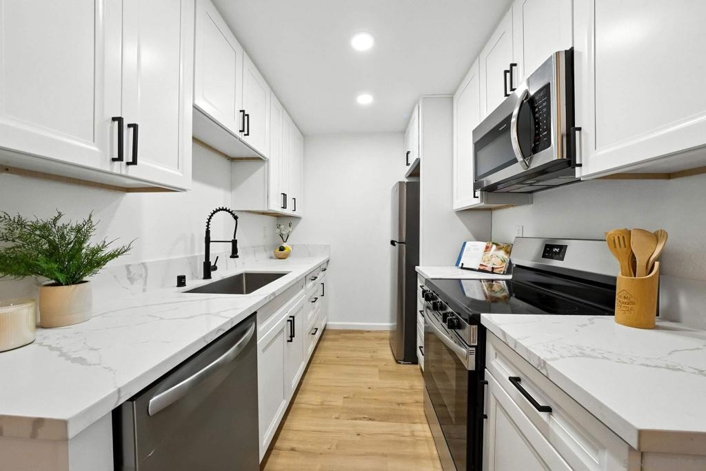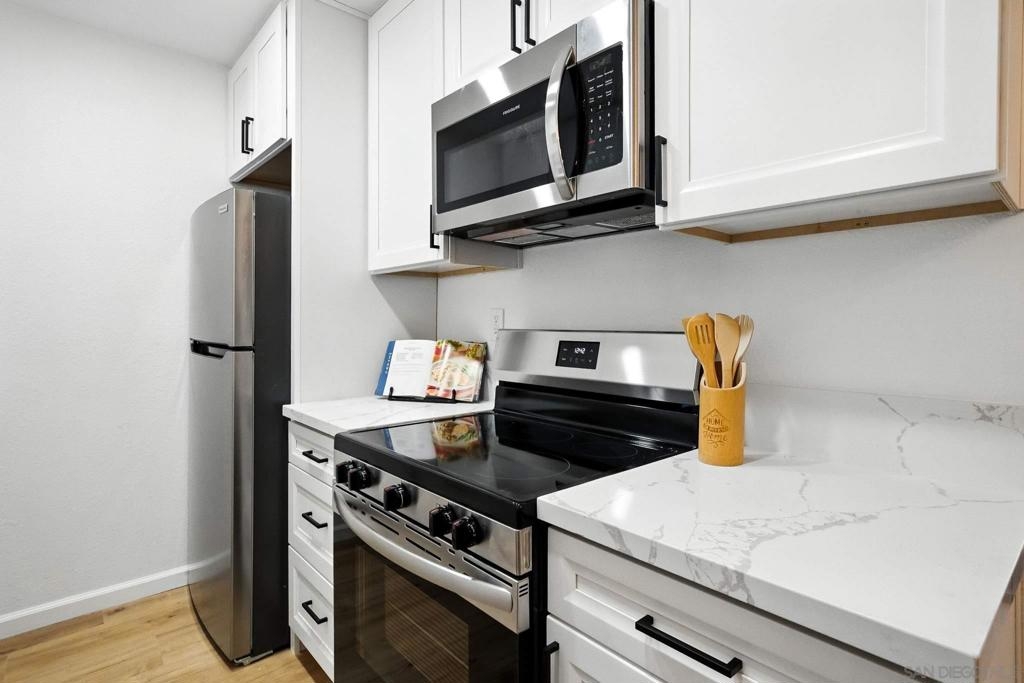Affordable and Modern. This beautifully renovated 1-bedroom, 1-bathroom condo offers modern living just steps from vibrant downtown Chula Vista. Perfect for first-time buyers, service members, professionals, or those seeking a stylish urban retreat, this move-in-ready gem combines contemporary upgrades with unbeatable convenience. Renovated kitchen featuring quartz counter tops, Modern shaker cabinets and luxury vinyl plank flooring throughout make this unit modern chic yet easy to clean. This turnkey condo is a rare find in a sought-after neighborhood in the heart of Chula Vista!