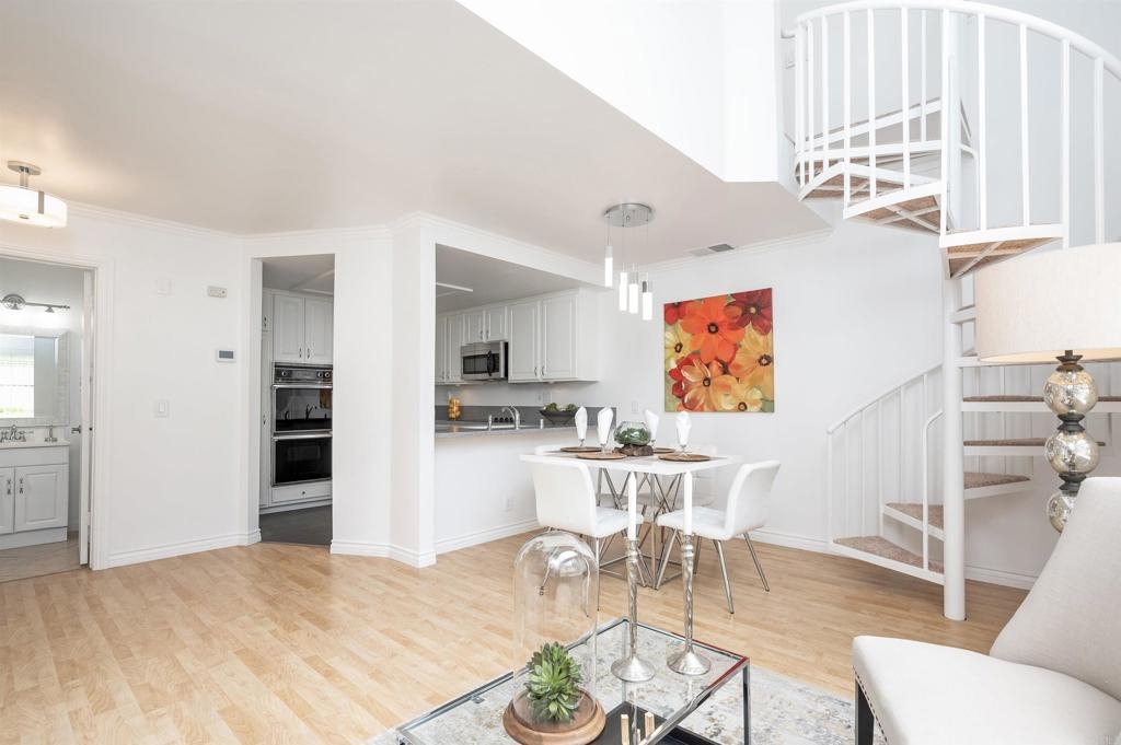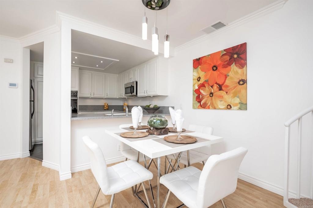 "ANOTHER SIMPLY DIVINE NEWLY REMODELED CORNER UNIT" VILLA MARTINIQUE ACROSS FROM LAKE!! OFFERS ONE MASTER SUITE AND ONE & HALF BATHS. MASTER BATH WITH UPGRADED TILE, UPGRADED COUNTER TOPS & CABINETS! DECOR TILE WALL AT VANITY AREA. IMPRESSIVE VAULTED CEILINGS & LARGE WINDOWS TO ENJOY THE BEAUTIFUL VIEW TO MATURE TREES. BRIGHT & FULL OF LIGHT! REMODELED WITH MODERN FEATURES! WOOD LAMINATE FLOORS, CAN LIGHTS W/DIMMER, MODERN VANITY W/CUSTOM MIRRORS, MODERN LIGHT FIXTURES. SPACIOUS KITCHEN W/DOUBLE OVEN & STAINLESS STEEL REFRIGERATOR, GRANITE COUNTERS, LARGE PANTRY, ELECTRIC STOVE, STACKABLE WASHER & DRYER INCLUDED. FRESHLY PAINTED. DETACHED 1 CAR/GARAGE. NEWER AC UNIT! PRIVATE ENCLOSED PATIO! ENJOY A MORNING WALK LAKE, WALK TO TRADER JOES, TENNIS COURTS, WATER & TRASH INCLUDED.