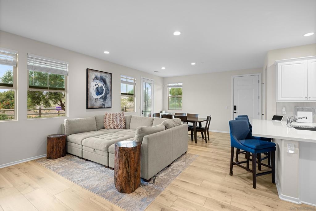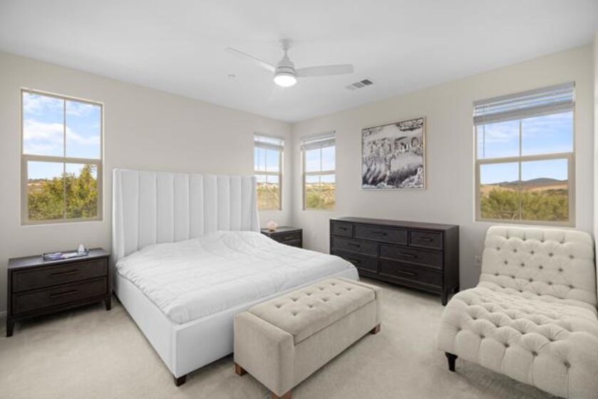 Experience life in the Village of Escaya. Positioned in one of the community’s most desirable locations this corner townhome offers panoramic canyon and trail views along with rare privacy and no homes in front. Natural light fills the home and unobstructed eastern exposure delivers stunning sunrises. The open floor plan includes a spacious great room a family room upstairs and well sized bedrooms including a primary suite with a generous bathroom and walk in closet. This home has been very well maintained and thoughtfully upgraded with modern lighting 18 leased solar panels an EV charging station and a tankless water heater. Residents enjoy resort style amenities including a pool gym clubhouse parks trails and a new school. The nearby village center offers shops and restaurants providing the perfect blend of convenience and modern living.