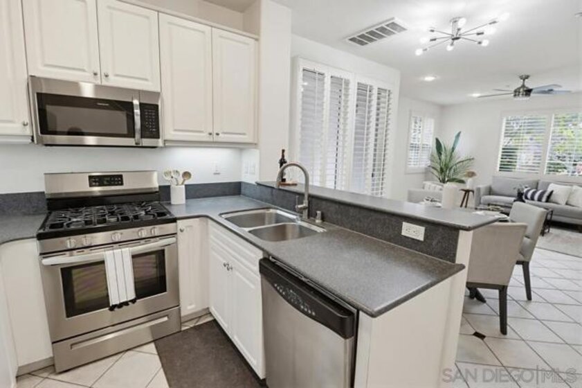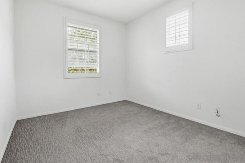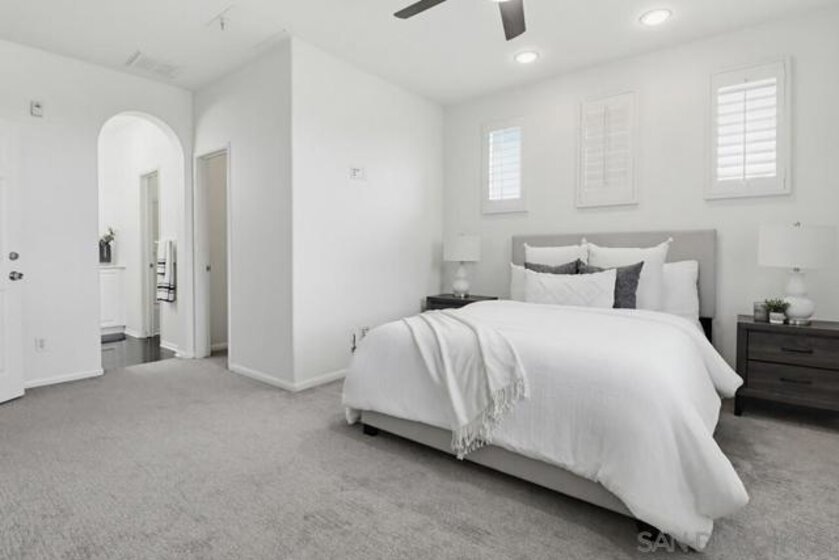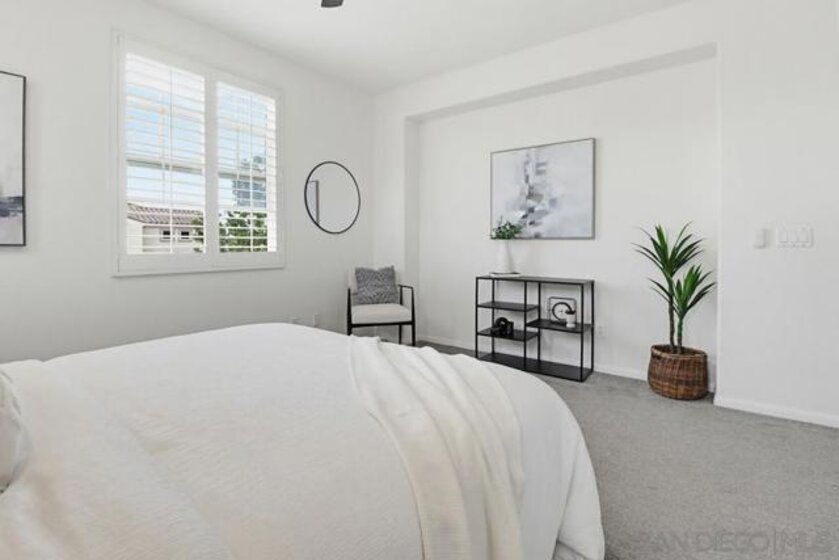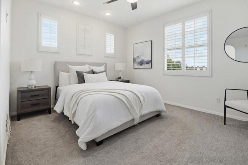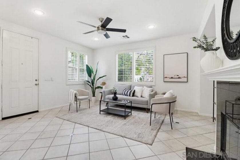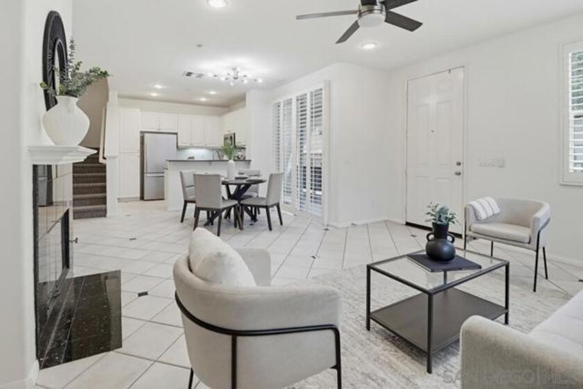 Stunning light-filled 1586 square foot 3-bedroom, 2.5-bath end-unit townhome in beautiful Hearthstone Village in Otay Mesa! This amazing home has been beautifully upgraded with contemporary finishes, including stainless steel appliances, recessed lighting, and plantation shutters. This beautiful residence offers an open, airy layout with abundant natural light and designer touches throughout. The main living area features a spacious great room with seamless flow to the kitchen and dining area, a lovely fireplace, and direct access to a private patio—ideal for relaxing or entertaining. The second floor boasts two generously sized bedrooms, each with ample closet space and access to an extra office/study area, and a shared full bathroom. Also on this floor is a conveniently located laundry closet with a full-sized washer and dryer. Upstairs, the beautiful light-filled primary suite includes a upgraded ensuite bath with dual sinks and a large walk-in closet, offering both privacy and space. This amazing home also includes an attached two-car garage providing convenience and additional storage space. Residents enjoy access to community amenities including two pools, BBQ and picnic areas, and nearby parks. Conveniently located near top-rated schools, hiking trails, shopping and dining at Otay Ranch Town Center. Come see this amazing home and enjoy the absolute best of Otay Mesa living!