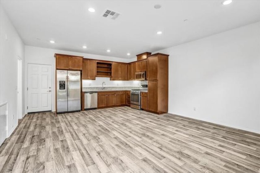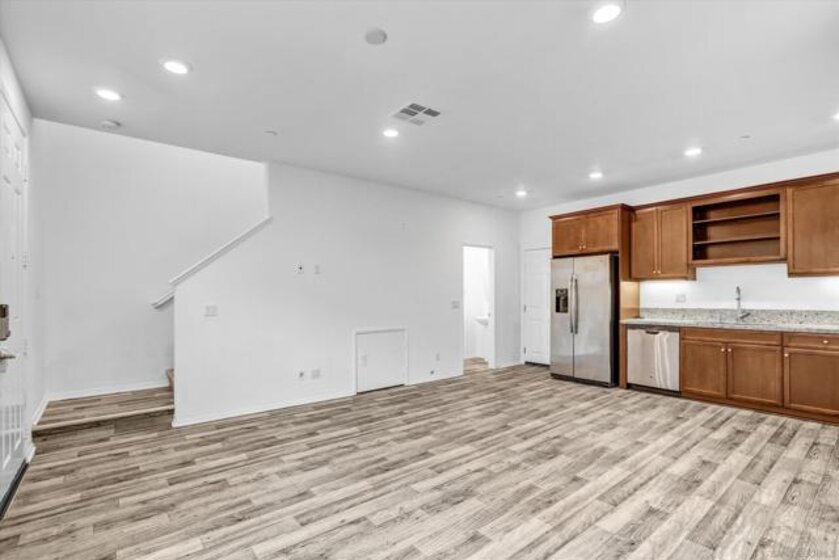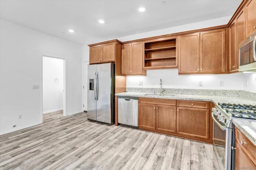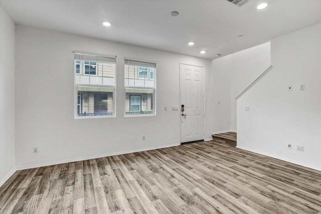 Welcome to this beautifully appointed 3-bedroom, 2.5-bath townhome offering 1,323 sq ft of modern living in the highly sought-after Lake Pointe community of Chula Vista. This light-filled home features an open-concept floor plan with high ceilings, elegant wood laminate flooring, and a stunning kitchen complete with granite countertops and stainless-steel appliances, including a French door refrigerator, 6-burner gas range, mounted microwave, dishwasher, and double-basin sink. The kitchen flows seamlessly into the spacious living area, enhanced by abundant natural light. The generous primary suite boasts a walk-in closet and a well-appointed ensuite bath with dual vanities. Secondary bedrooms are thoughtfully designed, with a split bathroom featuring a double vanity and convenient hallway access. Additional highlights include in-unit A/C, a separate laundry room, LED lighting, and a tankless water heater. Enjoy the convenience of an attached 2-car garage with direct kitchen access and a large private front patio perfect for relaxing or entertaining. Residents of Lake Pointe enjoy resort-style amenities including a community pool, spa, hot tub, clubhouse, and BBQ picnic areas. Ideally located within walking distance to the Olympic Training Center, Mountain Hawk Park, and scenic neighborhood trails, with easy access to parks, shopping, dining, and playgrounds. This home offers the perfect blend of comfort, convenience, and community living.