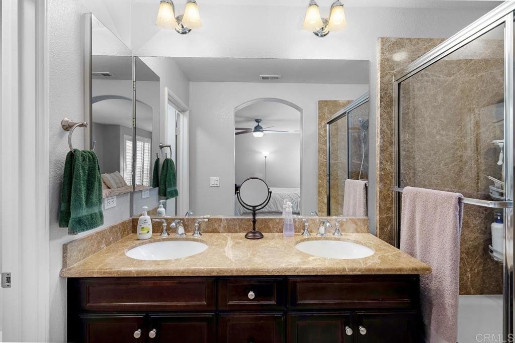 Welcome to luxurious townhome living in the sought-after Agave & Saguaro community of Winding Walk. This 2-bedroom, 2.5-bathroom home offers modern comfort and style, with an optional room that can easily convert into a 3rd bedroom or office space. The first floor greets you with a spacious den through French doors, perfect for productive workdays or quiet relaxation. Ascending to the second floor, you'll find an open-concept living space featuring a generously sized living room with a charming fireplace, ideal for cozy evenings at home. Prepare to be dazzled by the kitchen, boasting granite countertops, stainless steel appliances, a sprawling island, and ample cabinet space, catering to both cooking aficionados and entertainers. Additional features include a spacious 2-car garage, custom shutters, ceiling fans, and a spacious walk-in closet. The two bedrooms, strategically positioned for privacy, each offer their own en-suite bathrooms, providing retreats for every member of the household. Step outside to the inviting patio area, perfect for grilling or unwinding with a glass of wine.This townhome is just steps away from a vibrant children's playground and conveniently located near the community pool, offering endless opportunities for recreation and relaxation during the upcoming hot seasons. With proximity to a clubhouse, restaurants, bars, shops, Otay Ranch Mall, highly rated schools, and the 125 freeway, everything you need is at your fingertips, ensuring a lifestyle of unparalleled convenience and enjoyment. Don't miss your chance to make this idyllic retreat your own. Your dream home awaits.