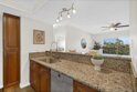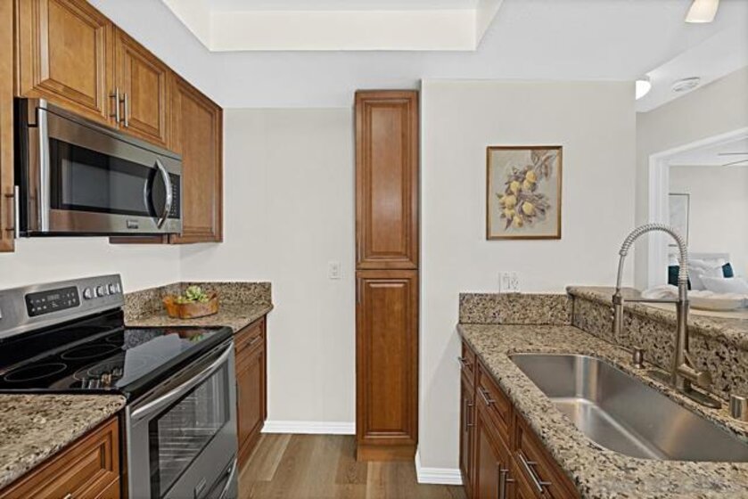 Fully upgraded 2bd/2ba condo with washer/dryer in unit. Granite counters in kitchen and baths, SS appliances, double sinks in bath w/ tub/shower combo. Private balcony with peek-a-boo views of the bay/marine layer. New laminate flooring in main area and kitchen. Top floor, corner unit. Only 1 shared wall. Building has an elevator and all doors in unit are 3 ft wide. Ceiling fans throughout. Ready for move in. 2 assigned parking spaces in back. HOA includes water, sewer, trash, and hot water.