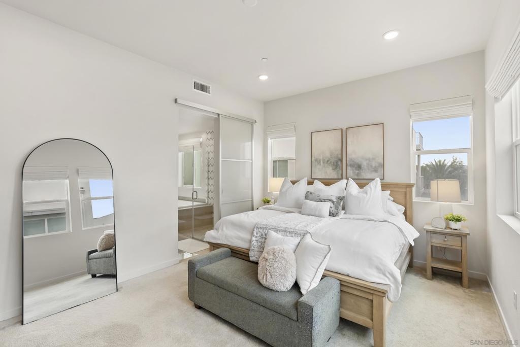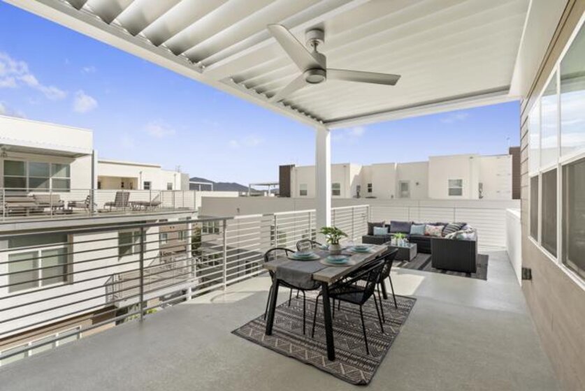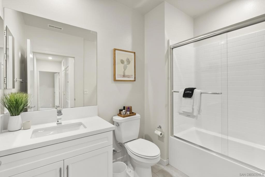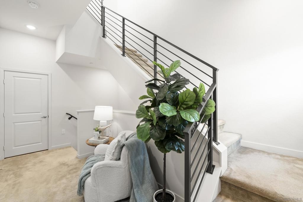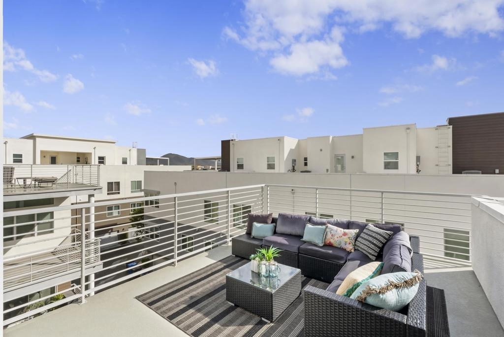 Located in the Pinnacle development at Millenia in Otay Ranch, this corner-unit condo offers thoughtful design, functional living space, and expansive outdoor areas with mountain views from the rooftop deck. The home features an attached 2-car garage with storage shelving, EV plug-in, and a private elevator for easy access from the entry level to the rooftop deck. The main living floor features 3 bedrooms, 2 bathrooms, a laundry closet, living and dining areas, and a private balcony. 12-foot ceilings, Beachwood-style flooring, and an abundance of natural light. The kitchen is finished with quartz waterfall countertops, stainless steel appliances, a custom backsplash, and a gas range. The primary suite includes a walk-in closet, dual sinks, soaking tub, and a walk-in shower. The top level features a loft/den that can function as an optional fourth bedroom, with a porcelain-tiled fireplace and direct access to the rooftop deck. The corner location provides views of the surrounding mountains, and with over 750 square feet of outdoor space between the two balconies, there is plenty of room to relax or entertain. Additional features include smart thermostats for the furnace and air conditioning, recessed lighting, and ceiling fans throughout. Residents of Millenia have access to a community pool, spa, and BBQ area, along with nearby parks, trails, schools, restaurants, and approximately 300,000 square feet of retail and dining within walking distance.