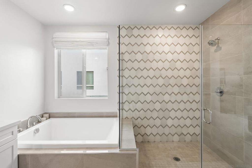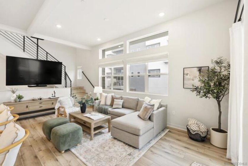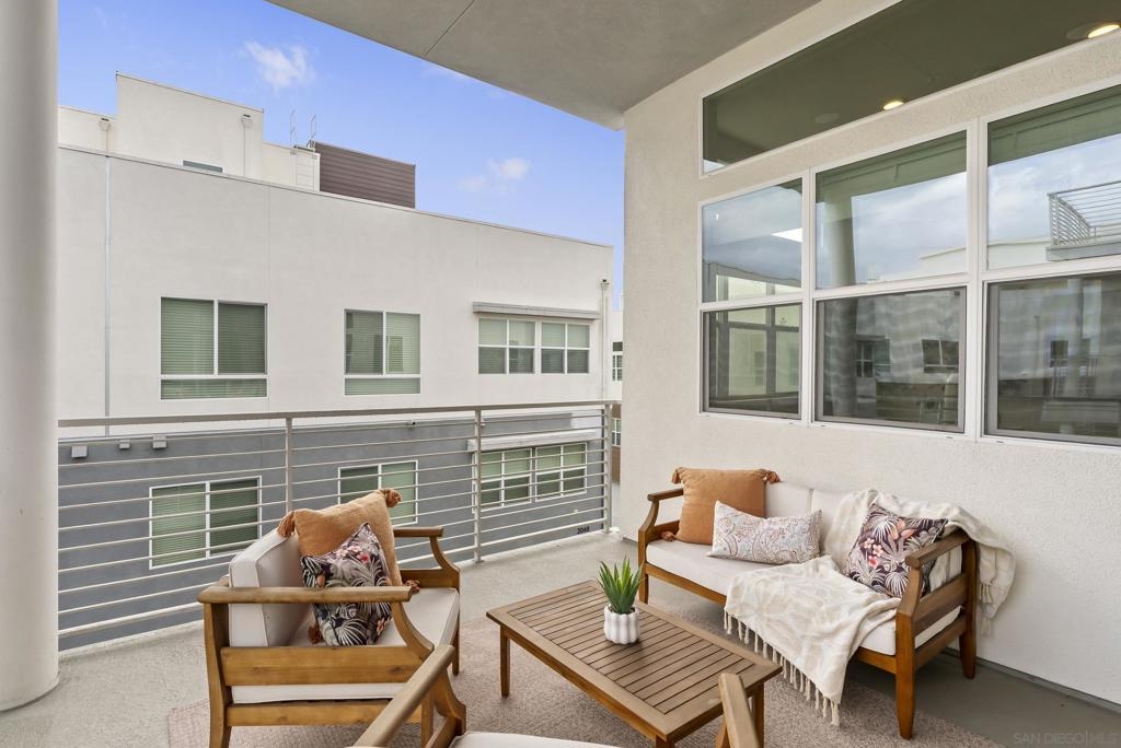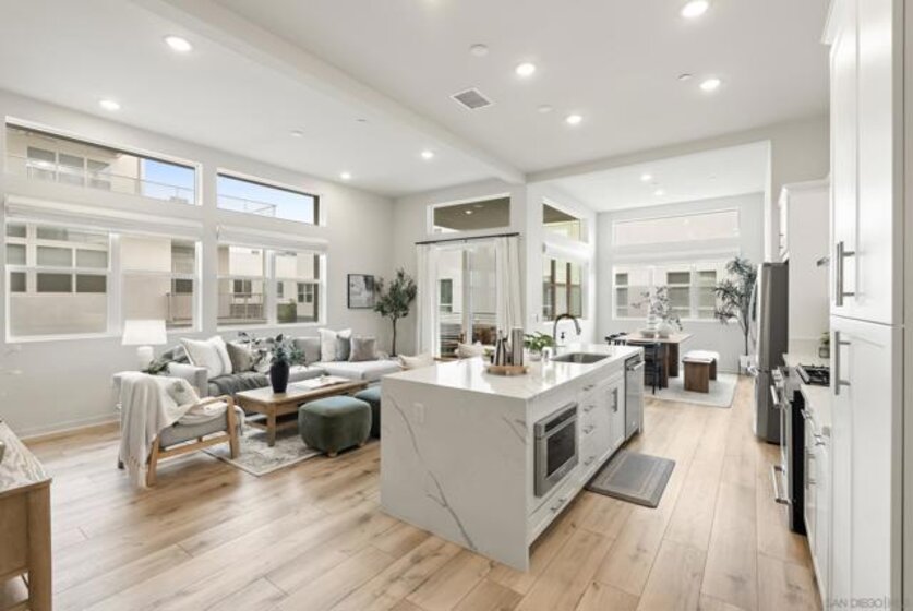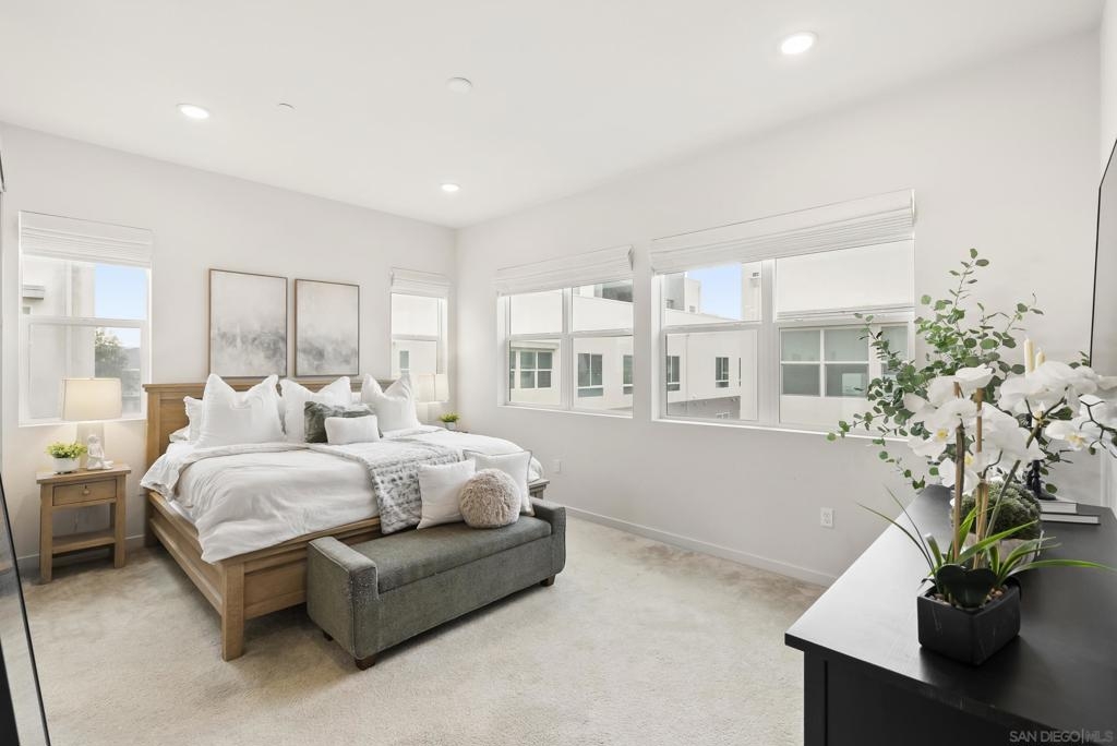 Located in the Pinnacle development at Millenia in Otay Ranch, this corner-unit condo offers thoughtful design, functional living space, and expansive outdoor areas with mountain views from the rooftop deck. The home features an attached 2-car garage with storage shelving, EV plug-in, and a private elevator for easy access from the entry level to the rooftop deck. The main living floor features 3 bedrooms, 2 bathrooms, a laundry closet, living and dining areas, and a private balcony. 12-foot ceilings, Beachwood-style flooring, and an abundance of natural light. The kitchen is finished with quartz waterfall countertops, stainless steel appliances, a custom backsplash, and a gas range. The primary suite includes a walk-in closet, dual sinks, soaking tub, and a walk-in shower. The top level features a loft/den that can function as an optional fourth bedroom, with a porcelain-tiled fireplace and direct access to the rooftop deck. The corner location provides views of the surrounding mountains, and with over 750 square feet of outdoor space between the two balconies, there is plenty of room to relax or entertain. Additional features include smart thermostats for the furnace and air conditioning, recessed lighting, and ceiling fans throughout. Residents of Millenia have access to a community pool, spa, and BBQ area, along with nearby parks, trails, schools, restaurants, and approximately 300,000 square feet of retail and dining within walking distance.