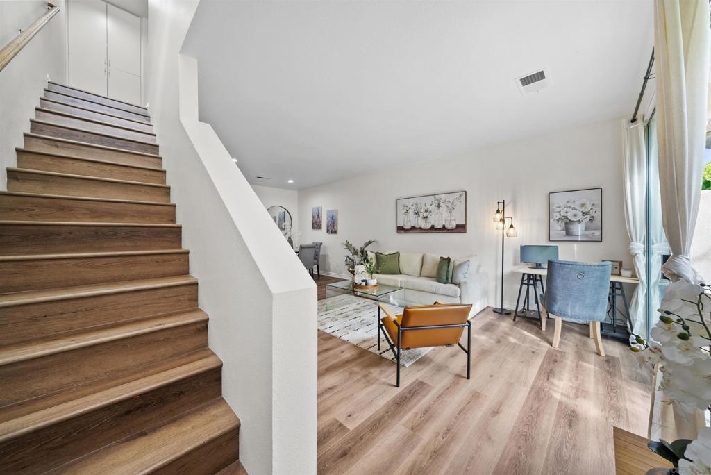 Welcome to this beautifully updated 2-bed, 2-bath townhome in the highly sought-after Rolling Hills community! This open and inviting home features upgraded flooring throughout, fresh paint, updated bathrooms, and recessed lighting, creating a modern and stylish feel. Plus, central AC and heat ensure year-round comfort. The living area flows seamlessly into the dining space and kitchen, perfect for entertaining. The spacious primary suite boasts a vaulted ceiling, upgraded vanity, and walk-in closet, while the second bedroom offers flexibility for kids, guests, or a home office. Enjoy the convenience of in-unit laundry, a private patio for outdoor relaxation, and the attached TWO-car garage for ample storage and parking. No MELLO-ROOS and LOW HOA. Nestled in a well-maintained community with a pool, spa, and playground, and just minutes from top rated schools, parks, shopping, and dining—this home has it all.