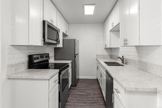 Modern & Move-In Ready, Just Pack Your Bags. This stylish 2 bedroom, 1 bath condo blends modern finishes with everyday comfort. Enjoy a modern kitchen with quartz countertops, sleek shaker cabinets, and stainless steel appliances. With vinyl plank flooring throughout, this home is perfect for first-time buyers. Located in Villa De Anita, a charming community in Chula Vista, enjoy peaceful amenities like a swimming pool, playground, laundry facilities, and assigned carport parking. Just minutes from the border, shops, restaurants, schools, beaches, and the San Diego Bay!