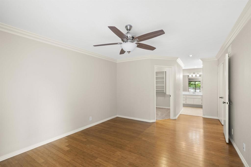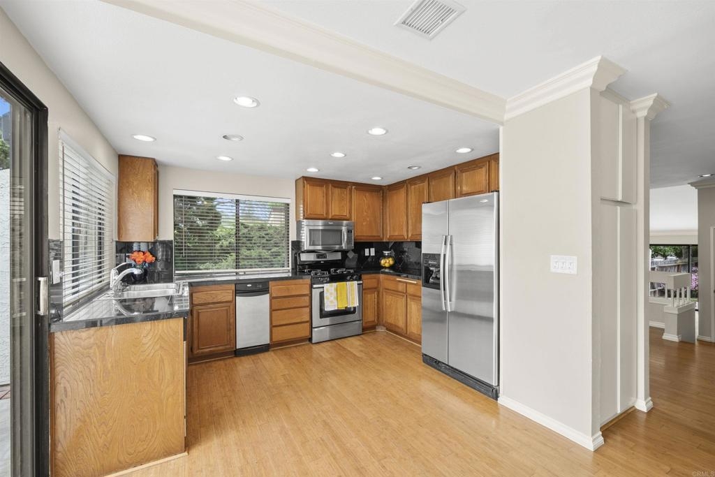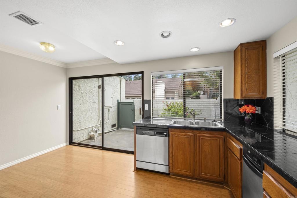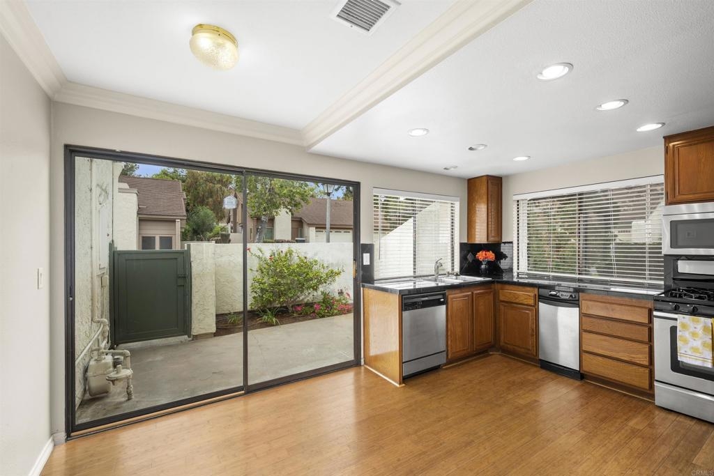 Chula Vista Hidden Gem! Don’t miss this rare opportunity to own a beautiful single-story home (there are 3 steps down to living room and 3 steps up to dining room) in one of Chula Vista’s best-kept secret neighborhoods. This end-unit features, bamboo flooring throughout, soaring ceilings and warm fireplace in the formal living room, crown molding, a spacious kitchen with access to a private patio—perfect for morning coffee or BBQs plus a separate dining room that can be used as a den or office. The primary suite includes a custom walk-in closet, double sinks, and direct patio access. Extra permitted storage room in attic accessed with pull down stairs in primary closet. Enjoy the peaceful backyard with a covered patio, ideal for relaxing or entertaining. Nestled in a quiet cul-de-sac, the community includes RV parking. Low HOA fess that covers roof, exterior maintenance, landscaping, pest control, and more. This one won’t last—schedule your tour today!